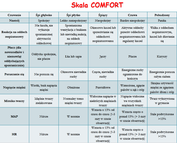 Skala COMFORT używana jest u dzieci sedowanych, najczęściej w OAiIT. Ocenia: poziom czuwania, nastrój, współpracę z respiratorem, poruszanie się, mimika twarzy, napięcie mięśni, średnie ciśnienie tętnicze i akcje serca.