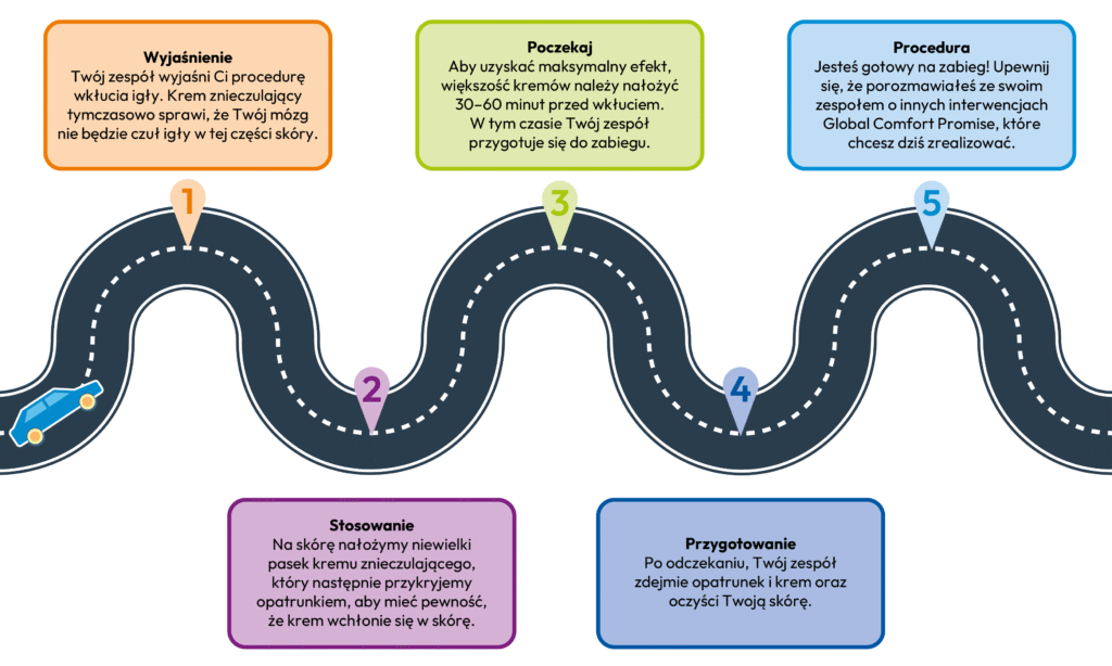 Znieczulenie miejscowe: Kremy (np. EMLA) nakładane min. 30 min przed zabiegiem.